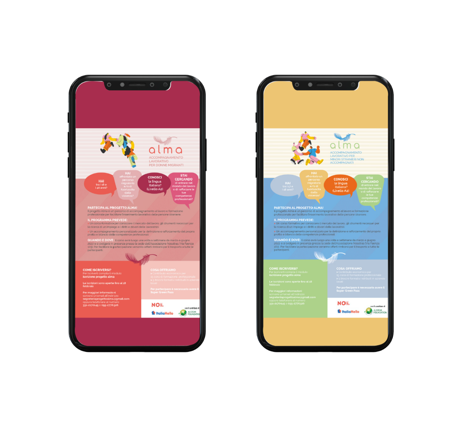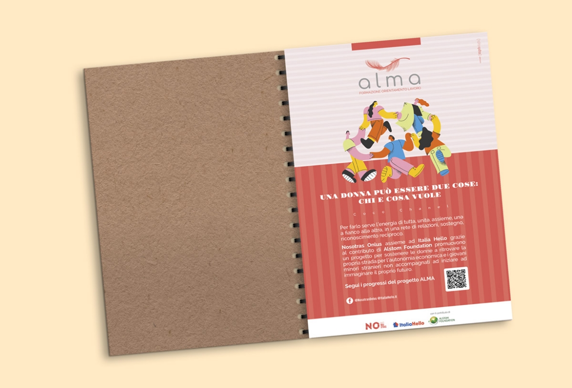 Alma è un progetto di Nosotras In collaborazione con ItaliaHello; è un percorso di formazione, orientamento e occupabilità pensato per donne migranti e minori stranieri non accompagnati residenti nell’area di Firenze, con l’obiettivo di favorirne l’empowerment, l’autonomia e l’inclusione socio-economica. https://nosotras.it/alma/