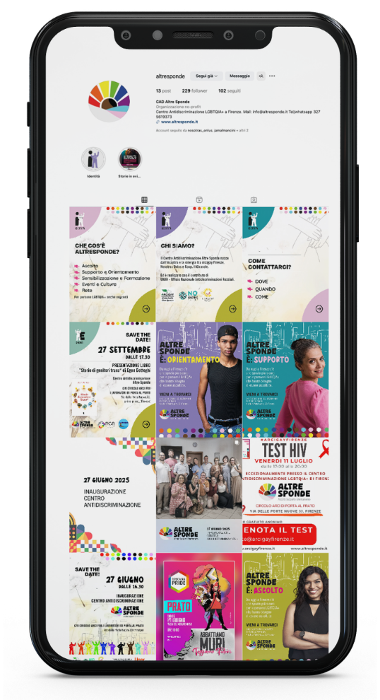 Per questo progetto ho curato l’identità visiva e la strategia digitale di un centro antidiscriminazione LGBTQIA+ recentemente aperto a Firenze: uno spazio sicuro e aperto alla comunità, nato per promuovere diritti, ascolto e inclusione.